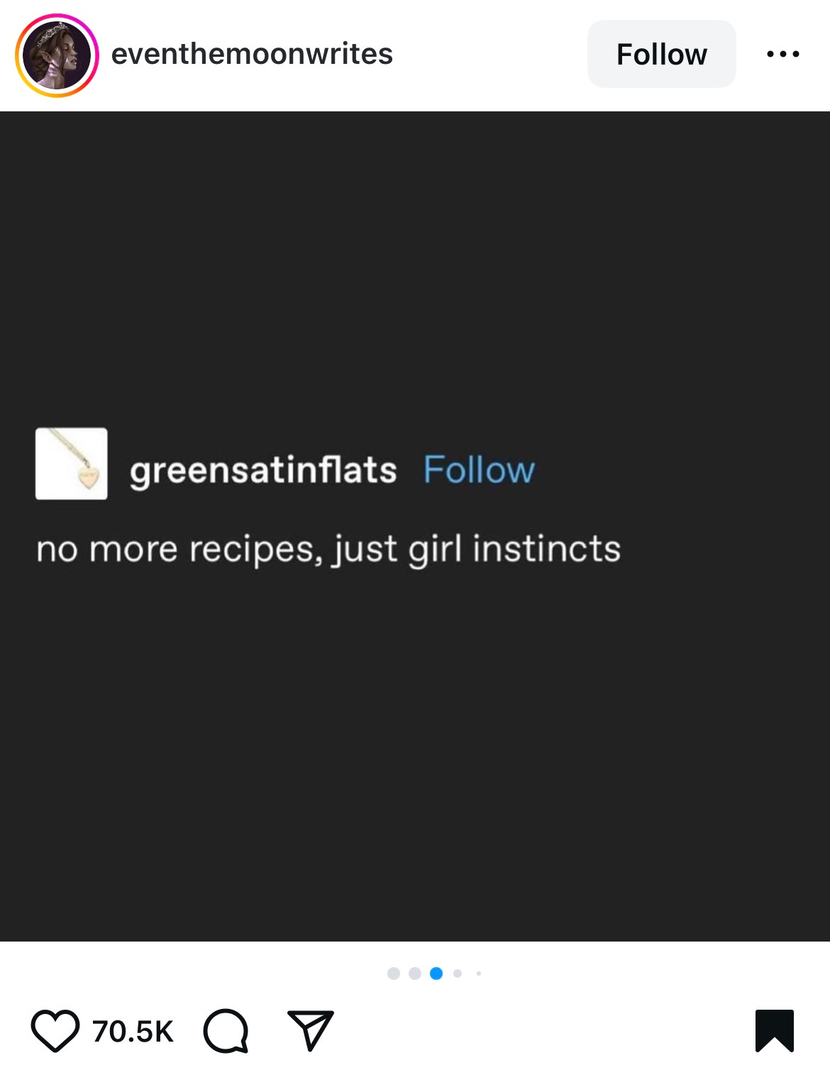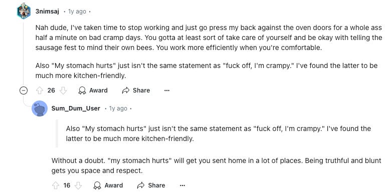 Also the underlying conversation of women being taught to attend to their emotional state versus men being taught to ignore their emotional state kept creeping up on the sides of this while reading. Men's hormones are constantly affecting their bodies and moods, but because they've likely been taught since birth to ignore most emotions they experience, men might not immediately recognize that their emotions and hormonal changes are linked. So women directly expressing that their bodies are assaulted by hormones, emotions, and physical pain in relation to the never-ending menstrual cycle (on top of any other ailments women may have or develop) may lead to women sounding whiny and like they can't hack it in the kitchen compared to their male counterparts. Whereas, the reality is, everyone in a kitchen is being absolutely blasted by their hormonal states and, based on what I know of the memes, undernourishing their brains and bodies in extremes. Women are just the ones talking about it.