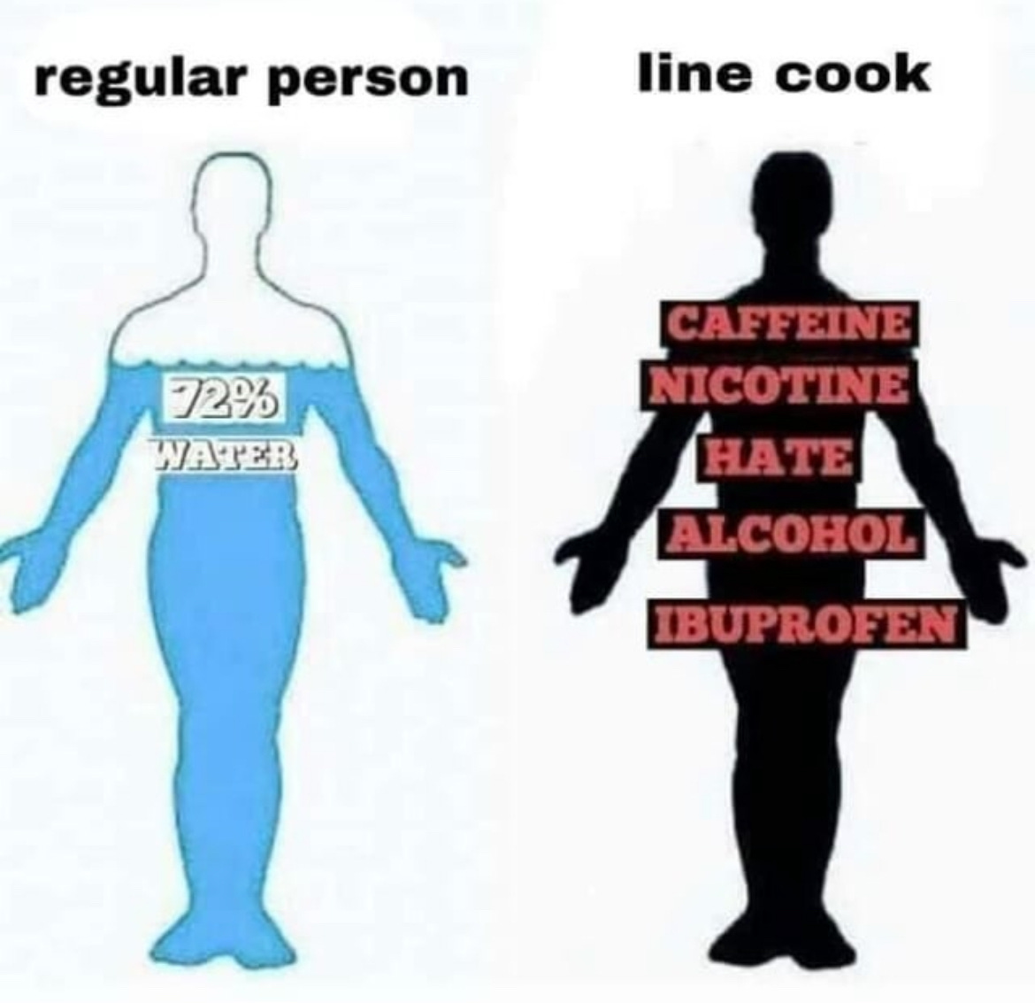 Add to that the rarity of proper healthcare (or living wage) and you have a recipe for burnout. Sprinkle in late nights, the craveable adrenaline rush, and late-night habits like drinking and drugs, and it soon becomes apparent that most line cooks are here for a good time, not a long time.